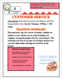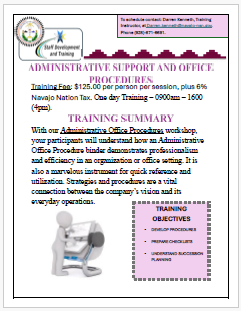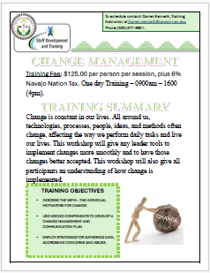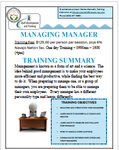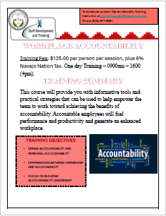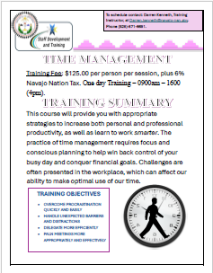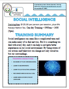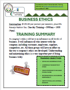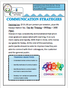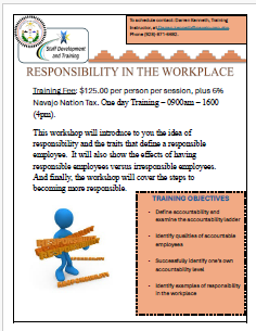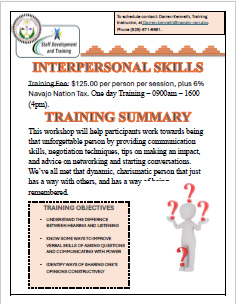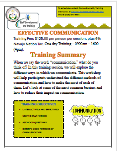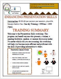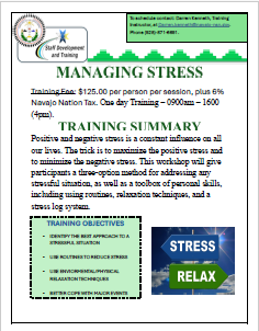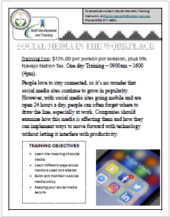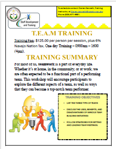 Training costs per person is $125.00 plus 6% Navajo Nation Sales Tax. Fees are non-refundable and substitution in your absence is acceptable. The deadline to register for each session is five days before the scheduled date.